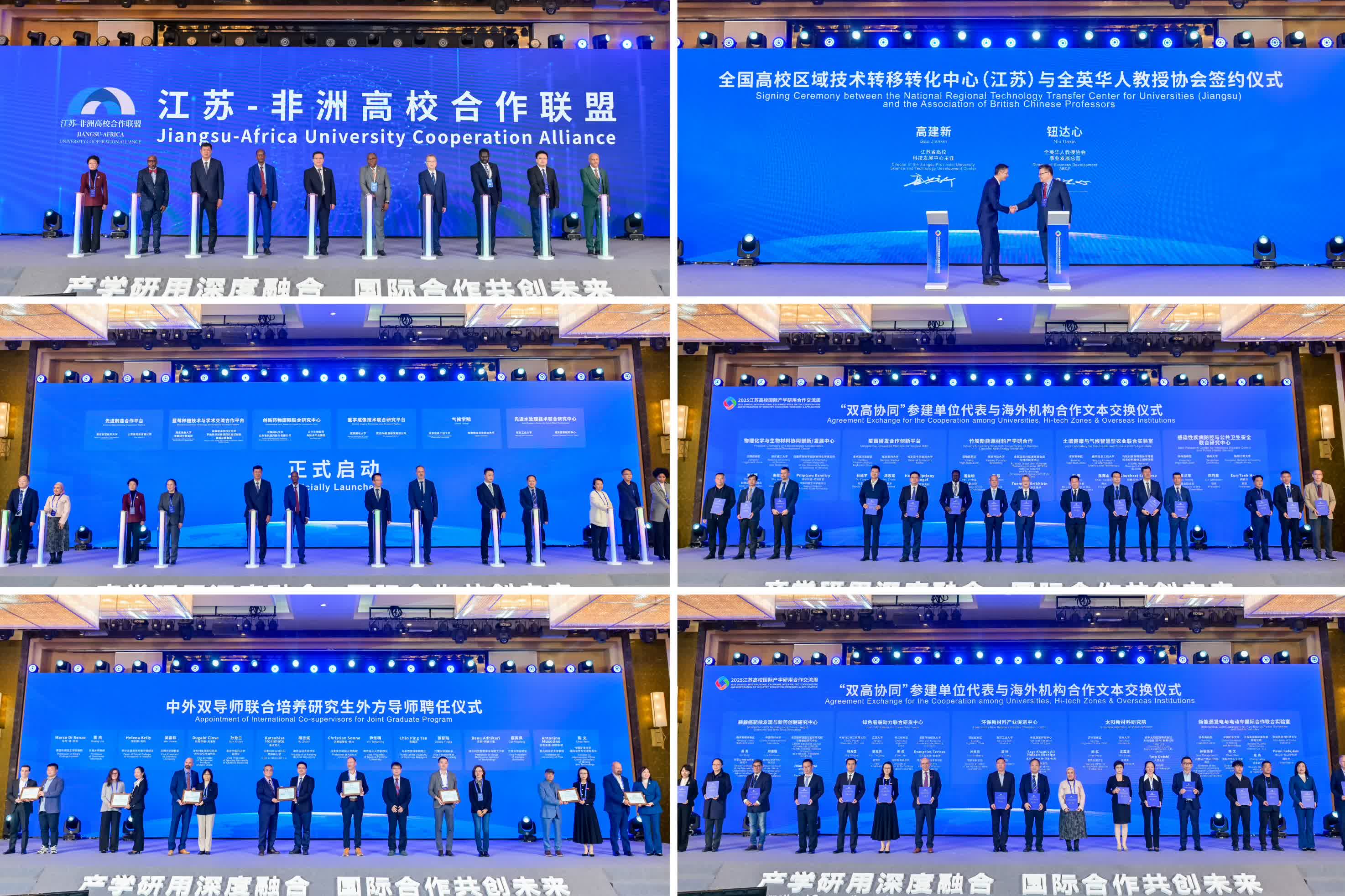 开幕式现场举行了江苏—非洲高校联盟成立仪式,发布了江苏高校国际产学研用十大合作成果。南京航空航天大学、南京农业大学等江苏高校与土耳其、美国等国外高校和企业签署了6项国际产学研用合作平台协议。东南大学、南京林业大学等8所高校现场聘任了一批中外双导师联合培养研究生外方导师。全国高校区域技术转移转化中心(江苏)与全英华人教授协会签署了合作备忘录。南京理工大学、开云真人注册等高校与江阴高新区、苏州高新区等高新区,以及法国国家健康与医学研究院、白俄罗斯科学院等海外机构签署了10个三方合作协议。